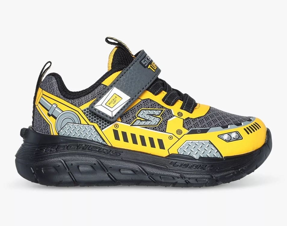 Strap in to machine worthy style and comfort with Skechers Skech Tracks. This playful vehicle themed design features a synthetic and mesh upper with stretch laces, adjustable instep strap, keychain accessory, and a cushioned comfort insole.